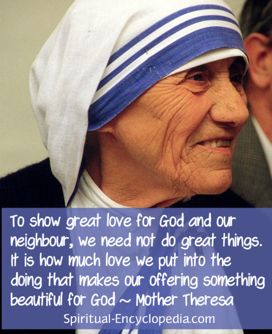 A Spoonful of Spiritual Quotes, your weekly-ish words of spiritual encouragement and wisdom, brought to you by Spiritual-Encyclopedia.com Dear, Here is one of the many wonderful quotes from Mother Theresa. To show great love for God and our neighbour, we need not do great things. It is how much love we put into the doing that makes our offering something beautiful for God. ~ Mother Theresa